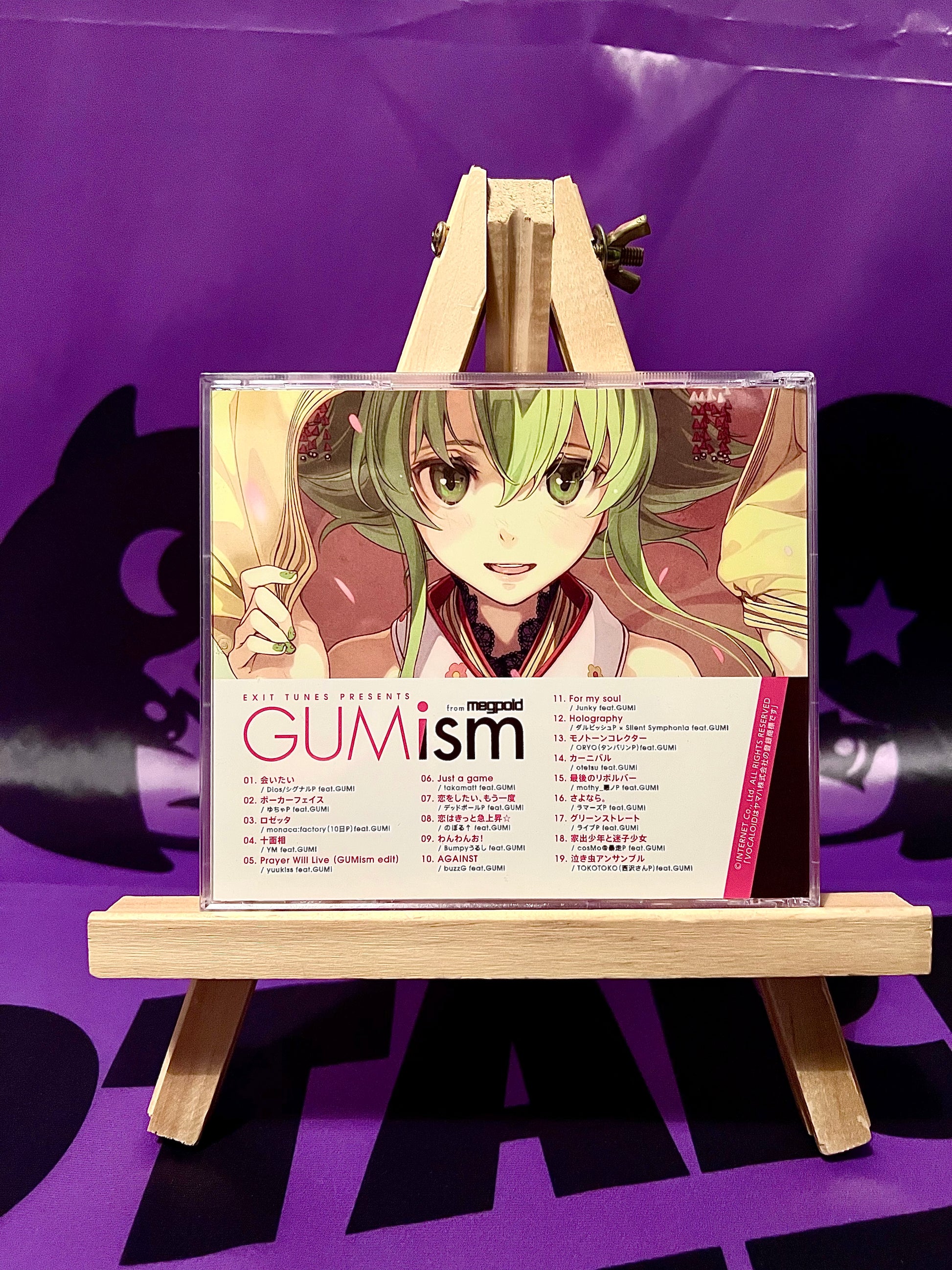 "GUMism" is GUMI's first compilation album on EXIT TUNES, the first internet compilation album, and VOCALOID's first solo compilation album. It contains 19 tracks, including newly composed pieces as well as some of GUMI's most popular songs, such as "Aitai" by Signal-P, "Poker Face" by Yucha-P, and "Ten Faced" by YM.